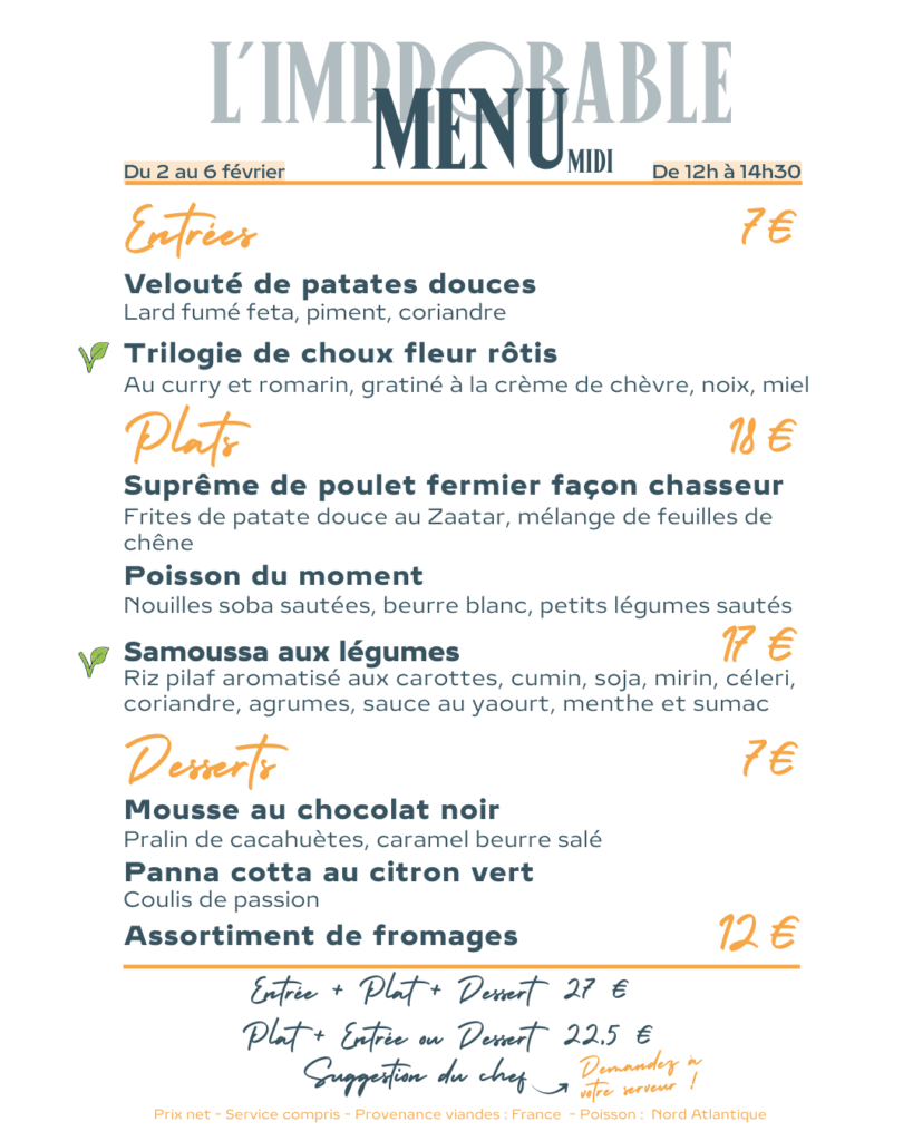 Chaque semaine, L’Improbable propose un menu entièrement renouvelé, imaginé à partir de produits frais et de saison.